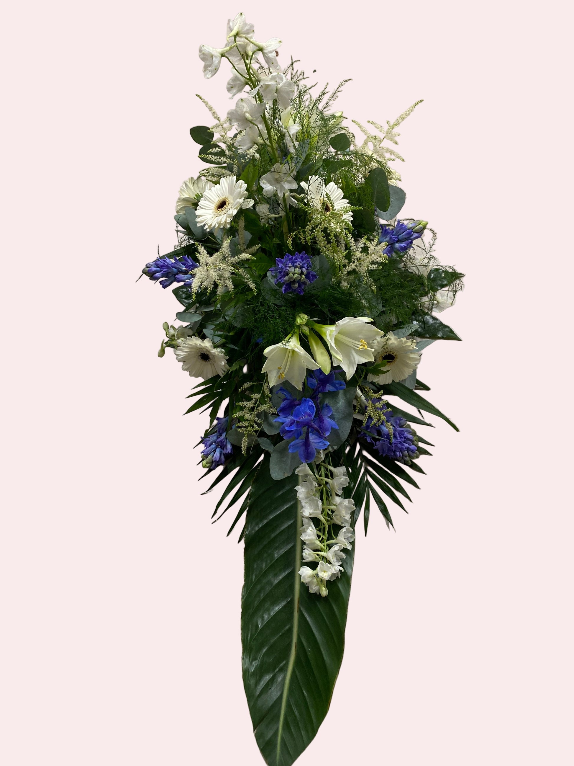 A calming Altar Decoration with blue delphiniums, white lilies, and gerberas, representing peace, comfort, and eternal rest.