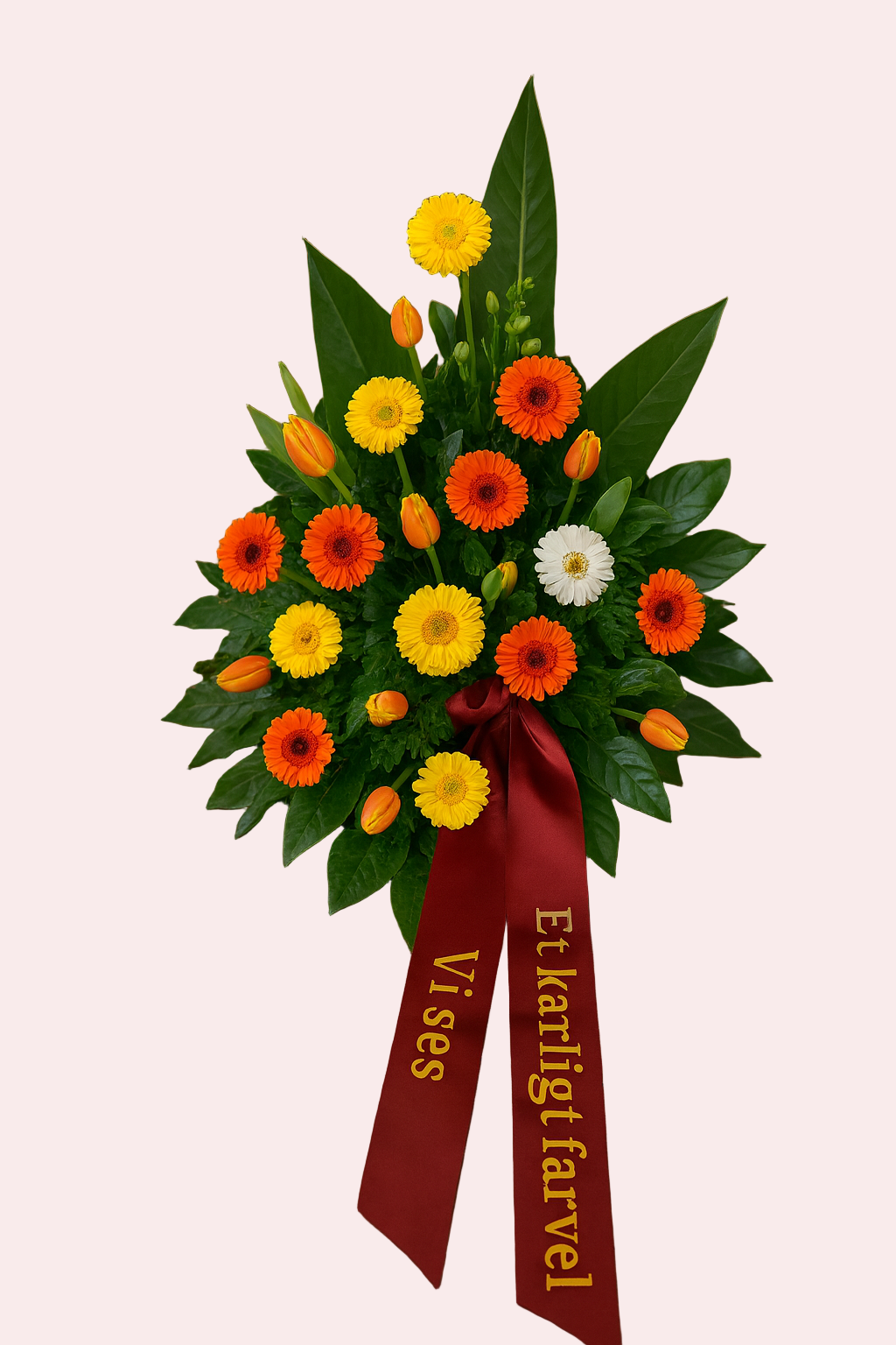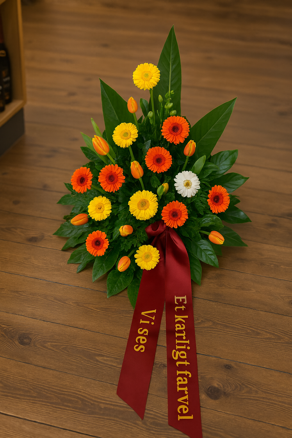 En strålende båredekoration fyldt med levende orange og gule blomster, der symboliserer lys, taknemmelighed og glædelig mindelse. Med gerbera, tulipaner og frodigt grønt giver denne arrangement en varm og hjertelig hyldest under afskedsceremonien. Designet til at bringe lys og fred, og repræsenterer håb og evig kærlighed.