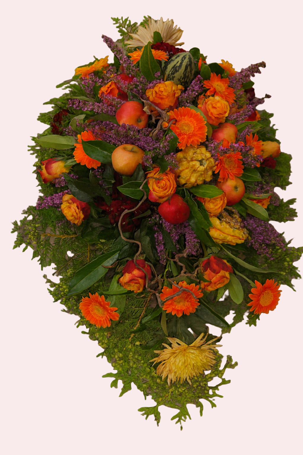Fejr et vellevet liv med denne efterårsdekoration , en unik hyldest der kombinerer varmen fra blomster med rigdommen af sæsonen. Arrangementet, designet i en stil, der indeholder orange gerbera, levende roser, lilla lyng, sæsonmæssigt grønt og symbolske høstfrugter som æbler og græskar. Blandingen af blomster og naturmaterialer skaber en stærk besked om taknemmelighed, overflod og evigt minde.