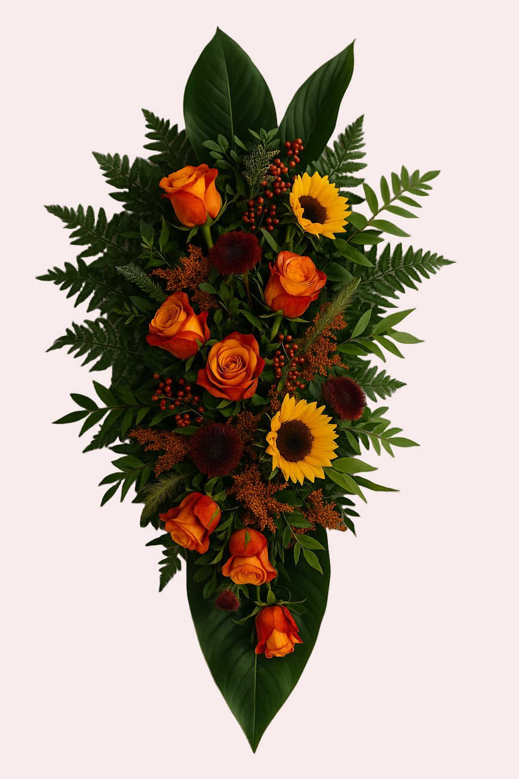 Denne efterårsinspirerede bårebuket er designet med varme, levende farver, der symboliserer kærlighed, taknemmelighed og minde. Med orangerøde roser, gyldne solsikker og sæsonmæssigt grønt skaber den en værdig og en hjertelig hyldest til begravelser eller mindehøjtideligheder.