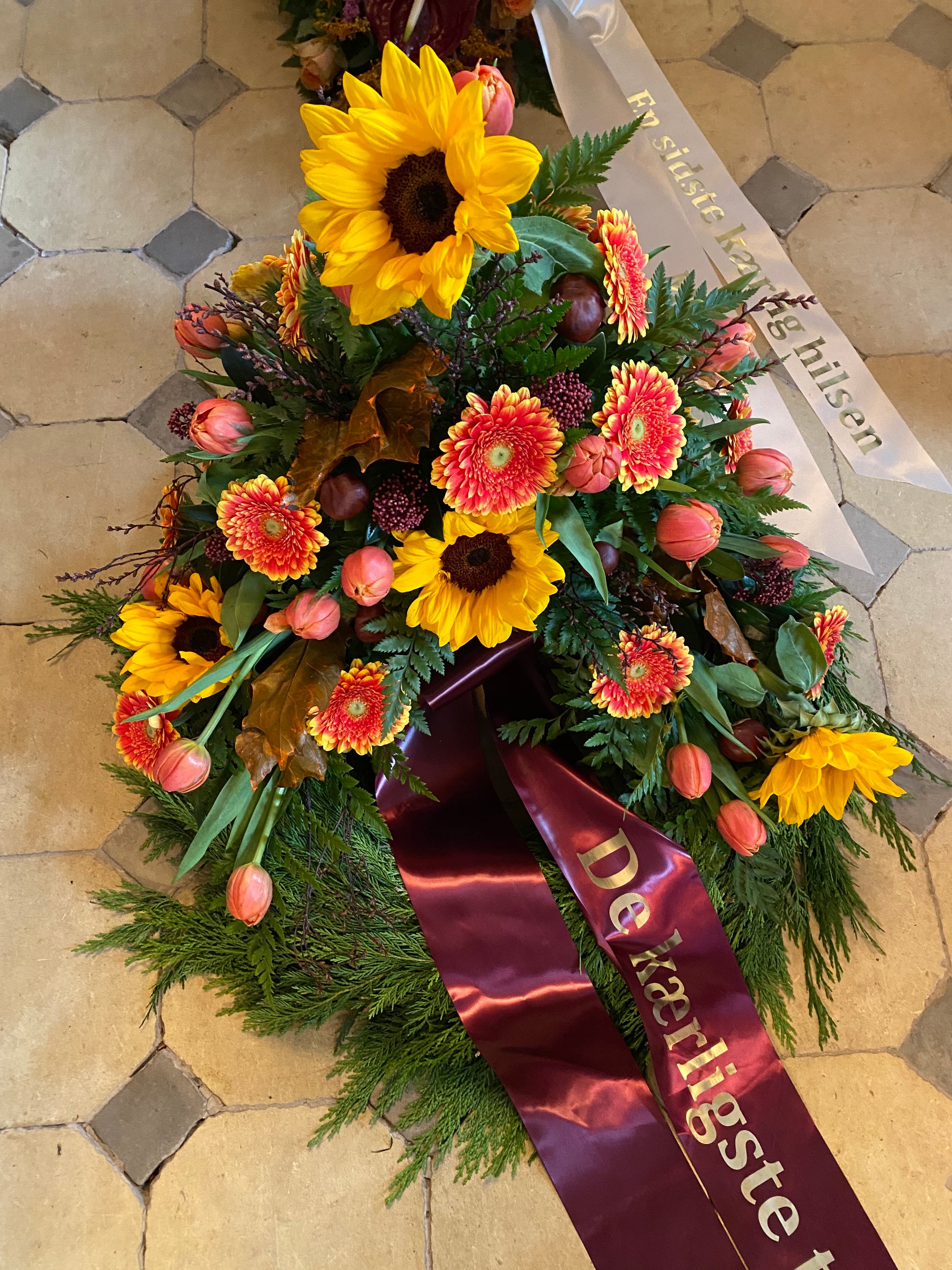 Vores efterårs krans er et hjertevarmt blomsterarrangement, der symboliserer kærlighed, taknemmelighed og erindring. Hvert design i Warm Memories-kollektionen er håndlavet af vores blomsterhandlere for at skabe en værdig og trøstende afsked.