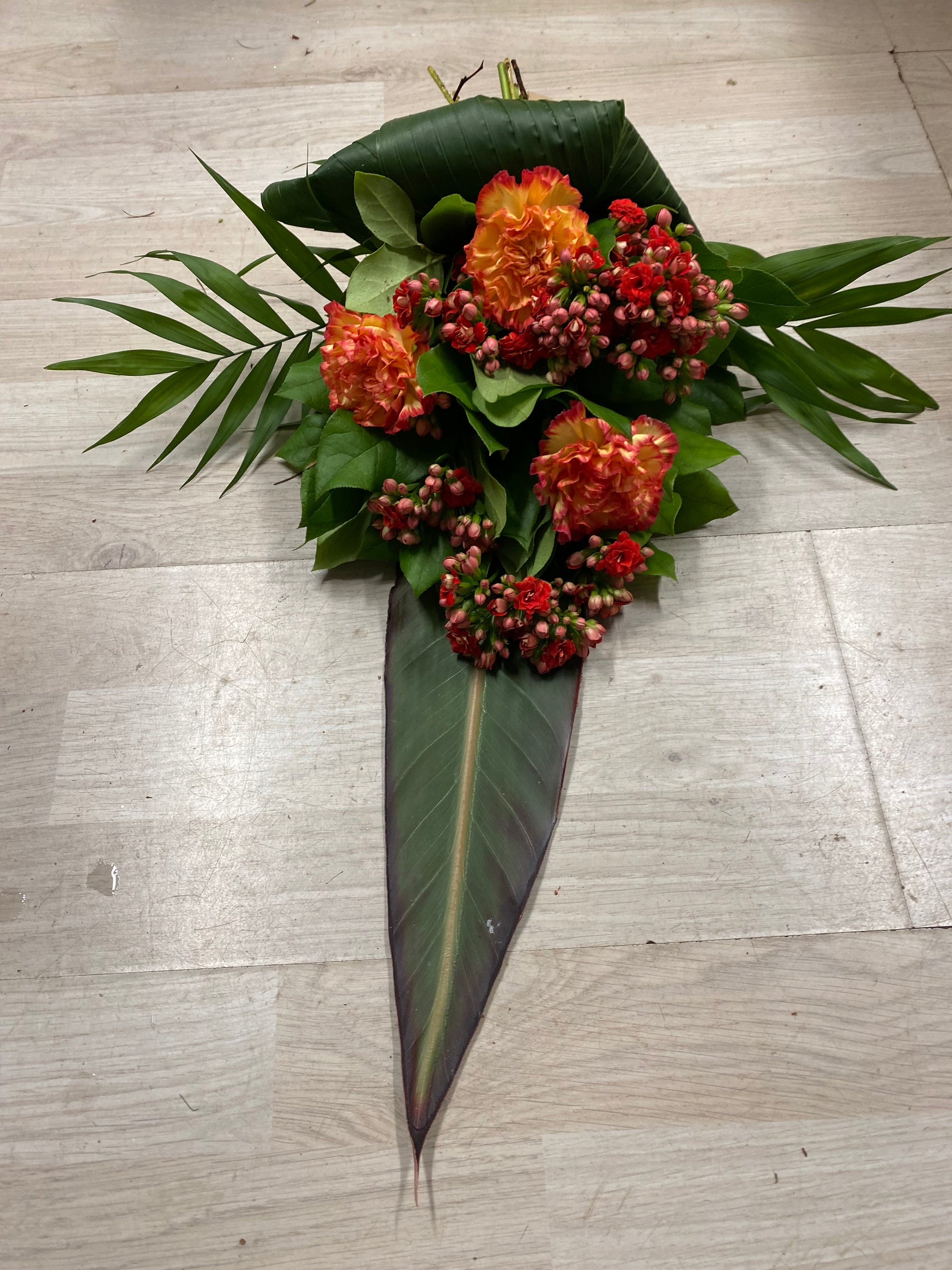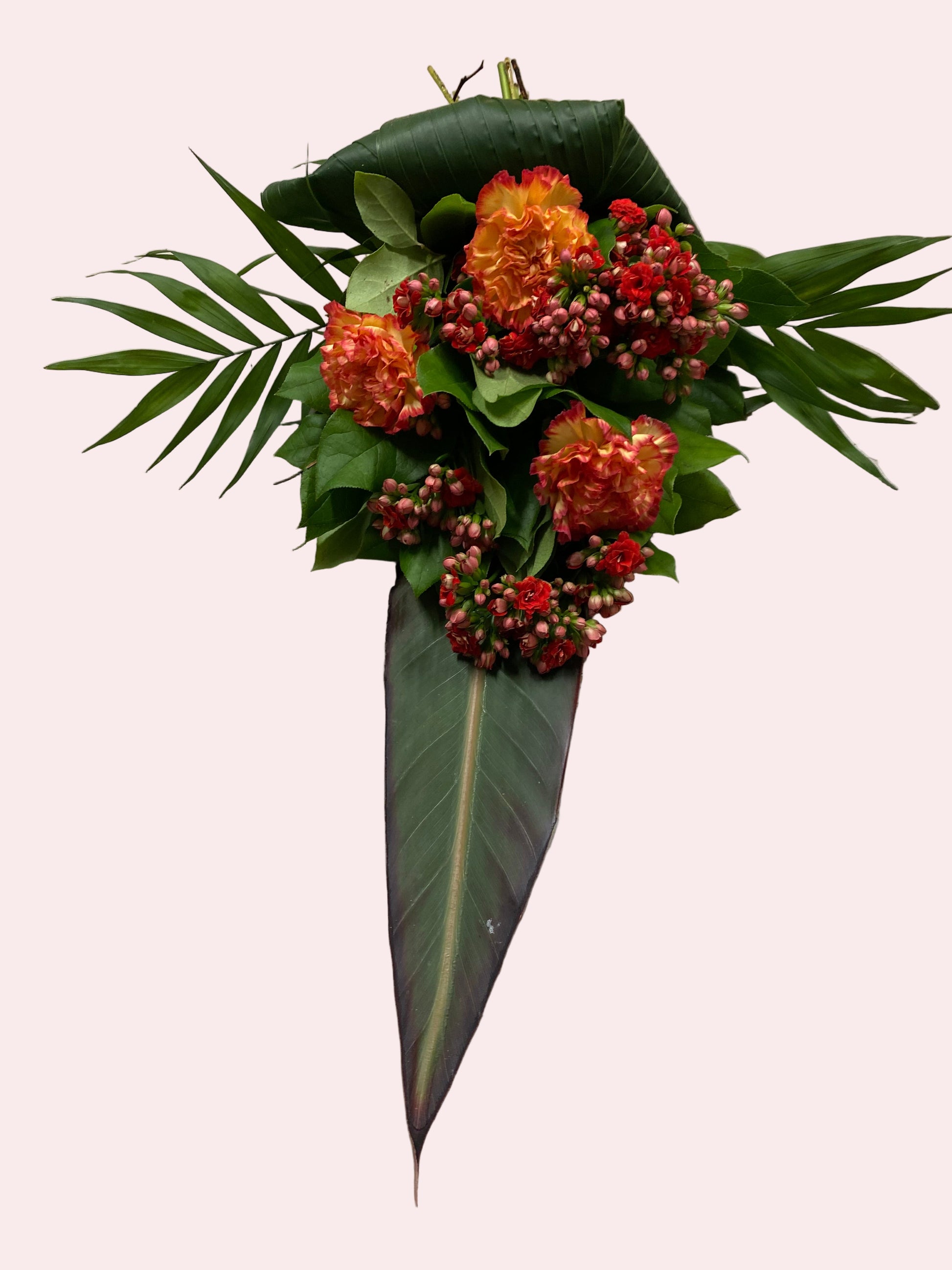 Vibrerende og varm, denne bårebuket indeholder orange nelliker og røde bourvardia omgivet af lyst grønt. En livlig, men respektfuld hyldest, der fejrer liv og varme. Perfekt til høstceremonier eller som en trøstende gestus af mindelse. Hver buket er håndbundet med omhu og opmærksomhed på farveharmoni.