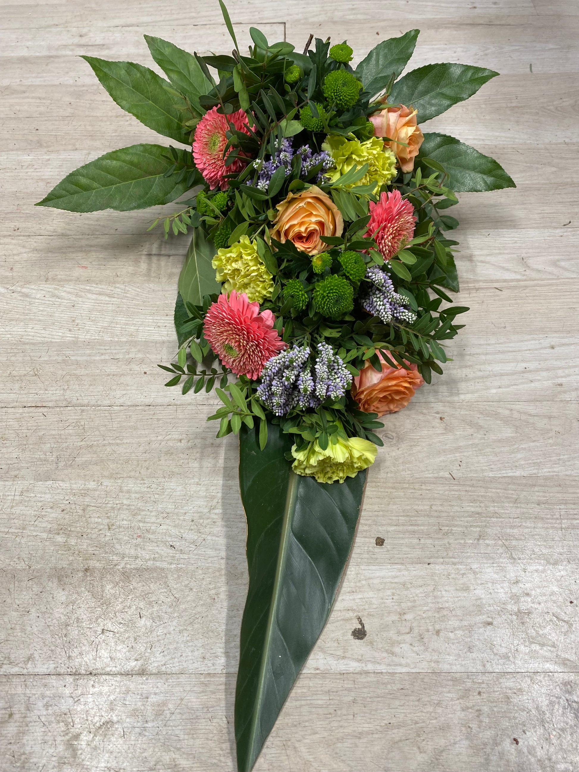 A soft and modern barebuket with pastel roses, gerberas, and green accents. The mix of gentle peach, lilac, and fresh greenery creates a calm and balanced tribute. Ideal for those seeking a bright yet subtle floral arrangement for a heartfelt farewell.