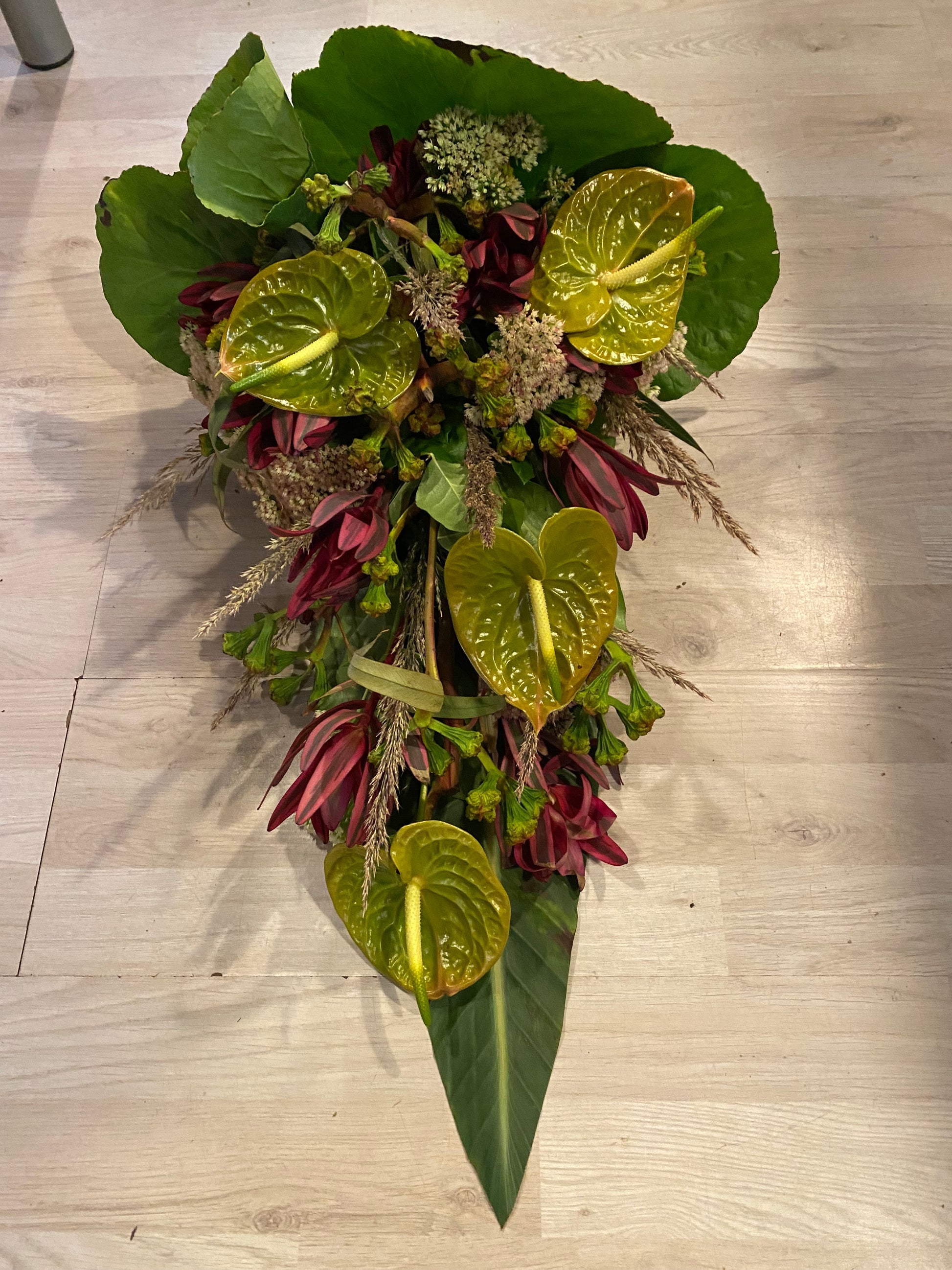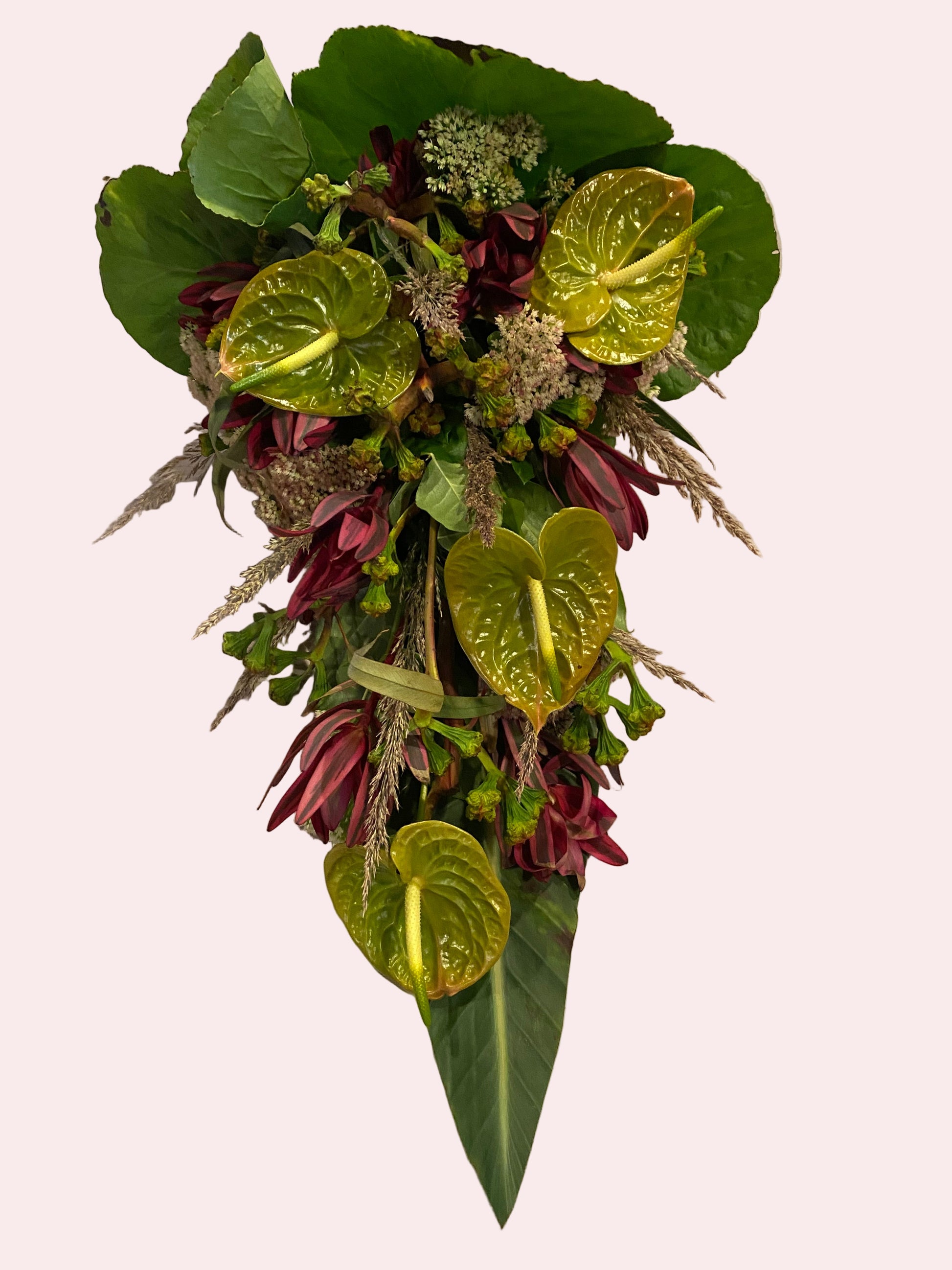 The Autumn Gold Funeral Floor Bouquet is an elegant tribute inspired by the beauty of nature’s changing seasons. Featuring striking green anthuriums, warm burgundy blooms, and natural greenery, this arrangement symbolizes strength, renewal, and everlasting love.