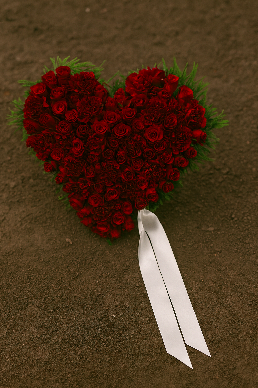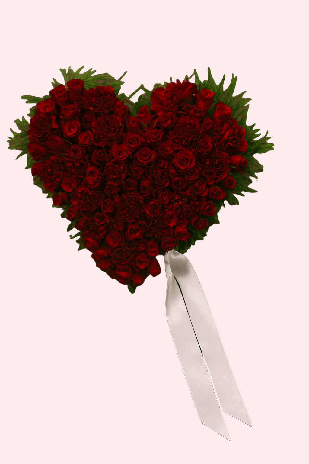 Et elegant, fyldigt rødt hjerte lavet med førsteklasses roser og nelliker, der symboliserer evig kærlighed og hengivenhed. Perfekt til at udtrykke dybfølt medfølelse og ære mindet om en elsket. De dybrøde toner bringer varme og værdighed til enhver afskedsceremoni.