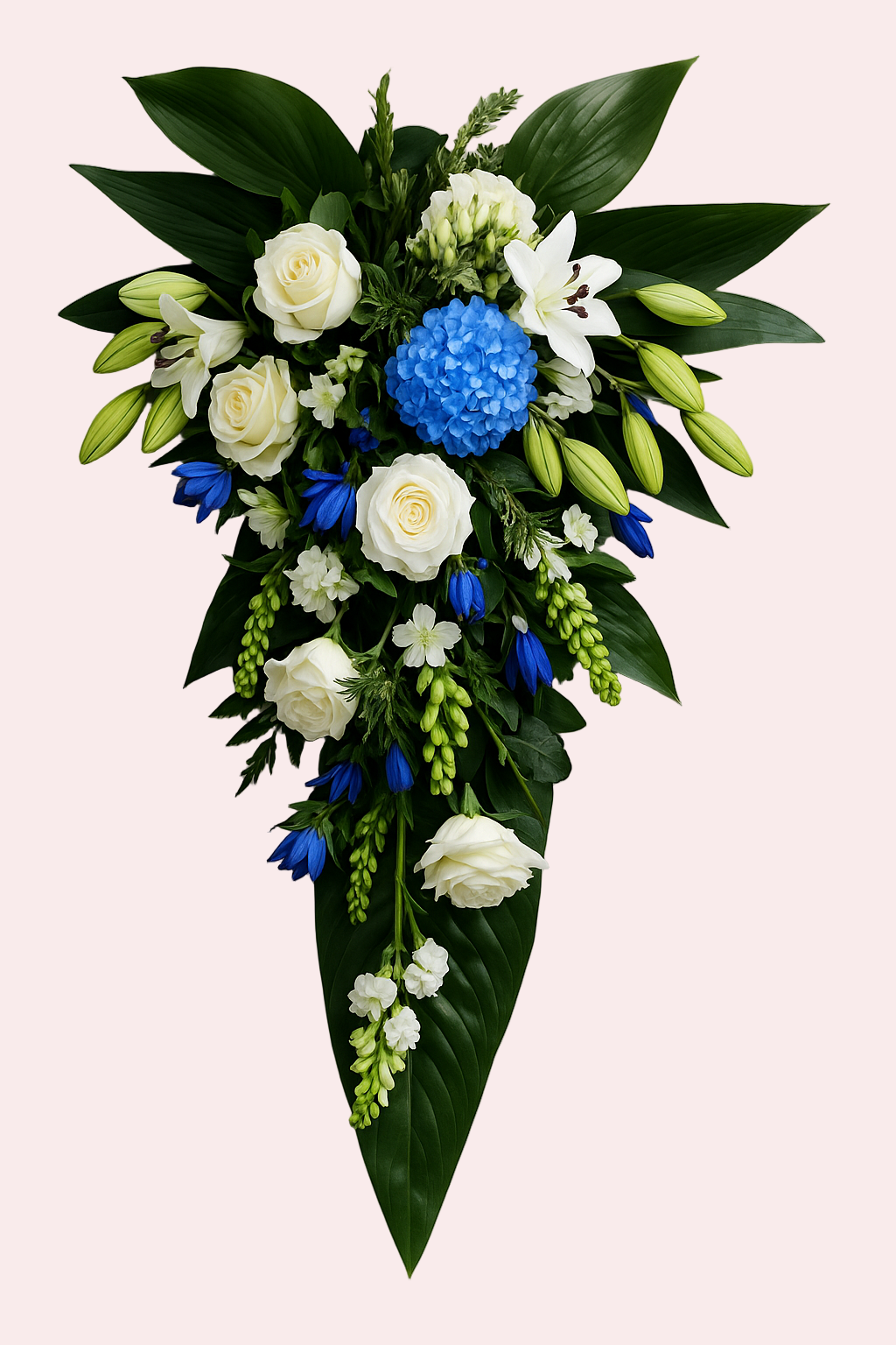 En fredelig og tidløs bårebuket, omhyggeligt sammensat for at udtrykke medfølelse og minde. Arrangementet indeholder hvide roser, liljer og sæsonens grønt, fremhævet med delikate blå hortensiaer og toner, der symboliserer fred og evig kærlighed.