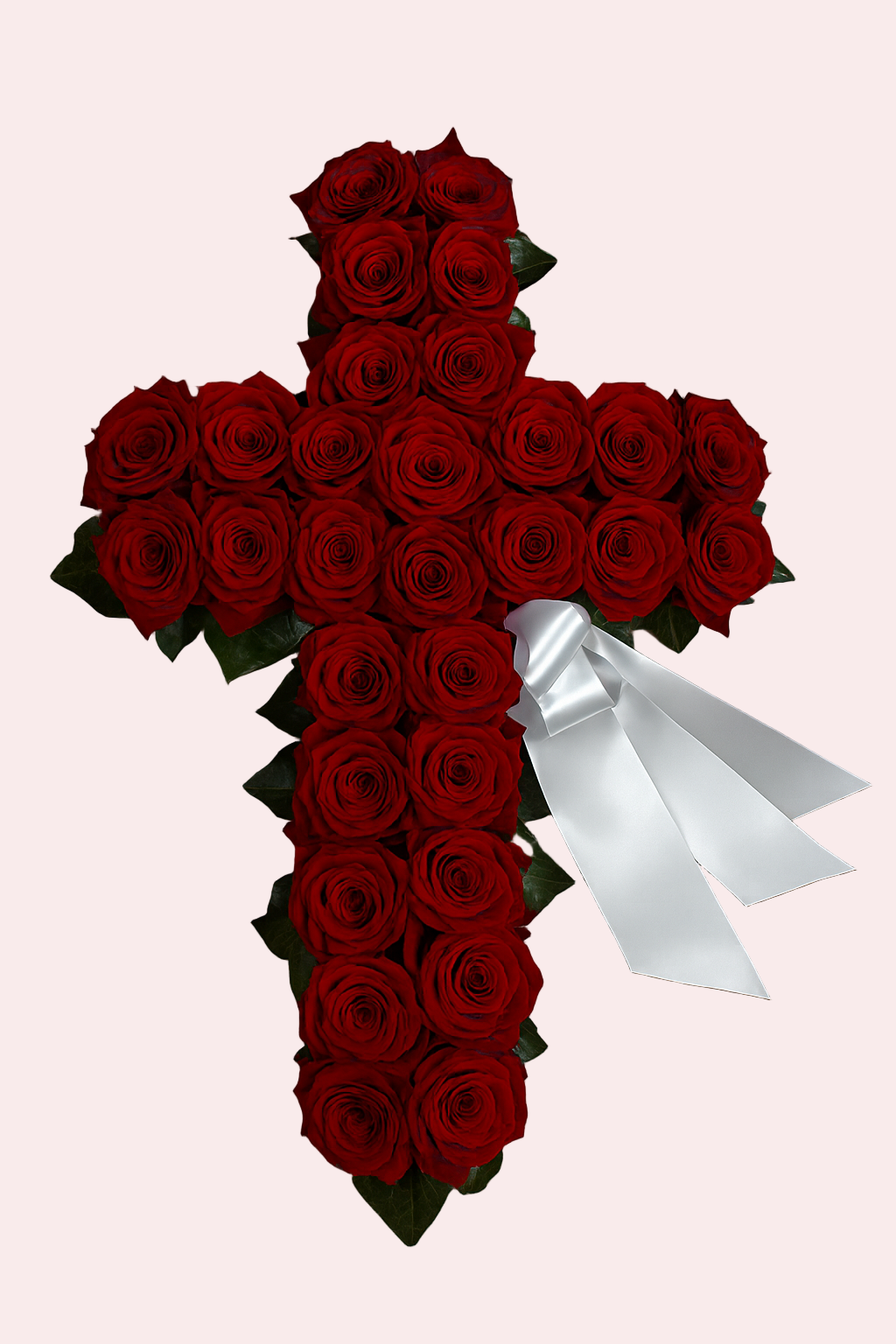 Et elegant kors der er omhyggeligt håndlavet til at bringe trøst og ære mindet om en elsket. De dyb røde roser udtrykker hengivenhed, mens korsformen repræsenterer tro, håb og evig fred. Perfekt som en hjertelig kondolence til begravelser, mindehøjtideligheder eller religiøse ceremonier.