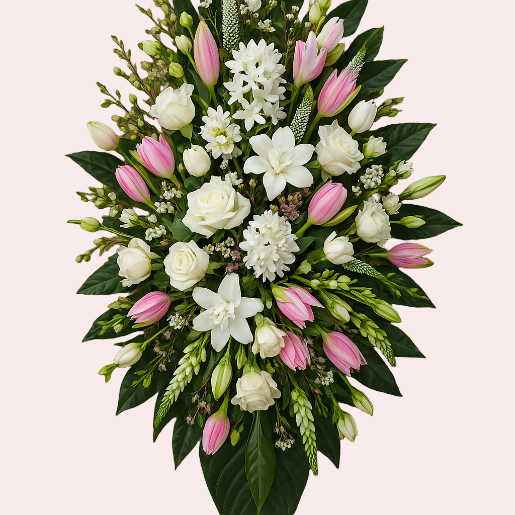 En smuk dekoration med hvide roser, lyserøde voksblomster, hyacinter og sæsonmæssigt grønt. Designet i en traditionel, aflang stil, er den en hjertelig måde at udtrykke medfølelse og minde. De bløde hvide og lyserøde farver skaber en fredelig og elegant hyldest til ceremonien.