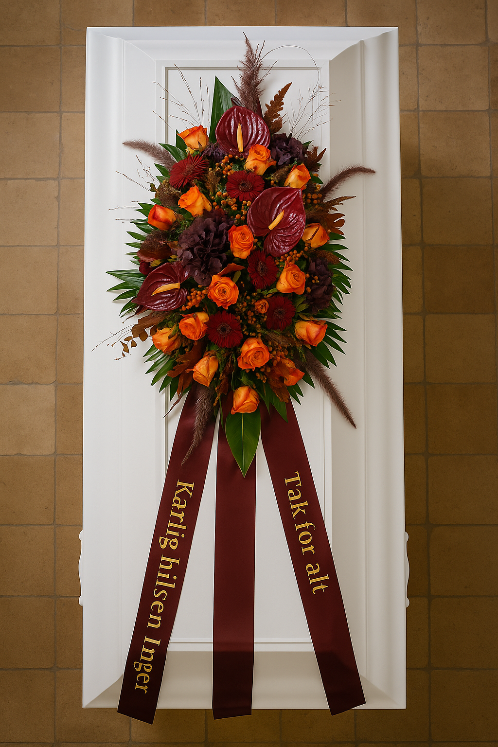 Med dristige anthurium, orange roser, gerbera og hortensia bringer det en værdig varme og moderne elegance til enhver afskedsceremoni.