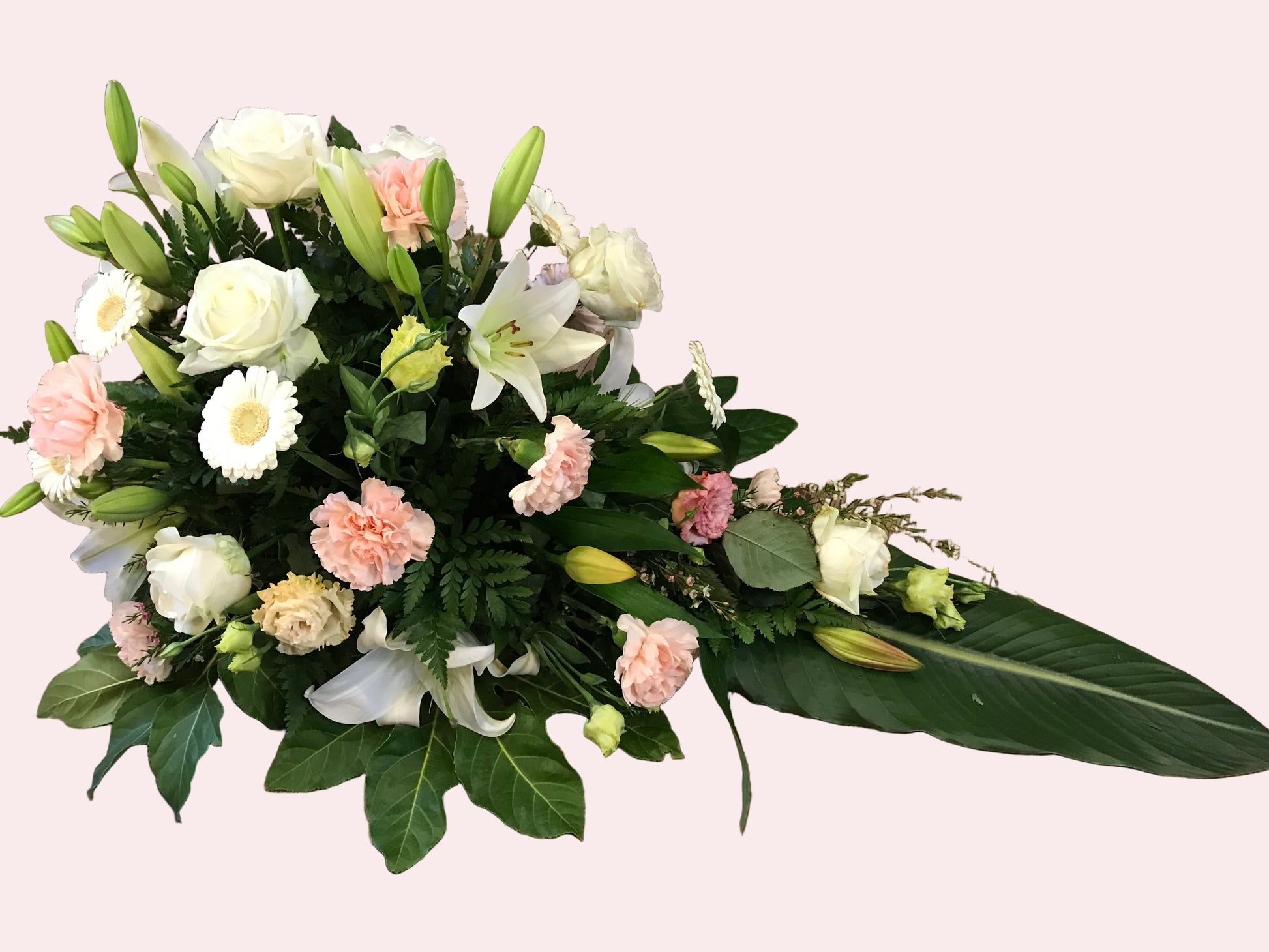 En blid båredekoration, der symboliserer kærlighed, fred og minde. Bløde lyserøde roser blander sig med hvide liljer og sæsonens grønt, og skaber en trøstende hyldest til afskedsceremonier. Håndlavet med omsorg og elegance.