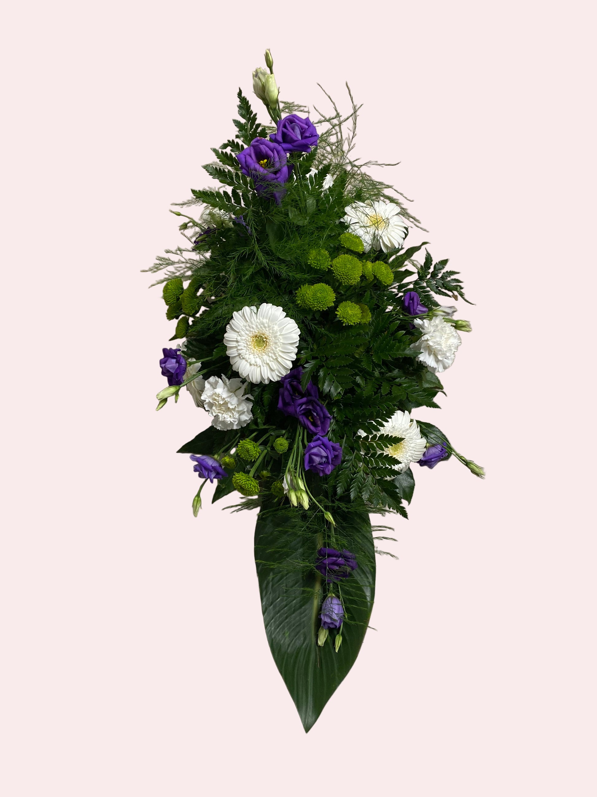 En båredekoration, der kombinerer lilla lisianthus, hvide gerbera og bløde grønne noter — symboliserer ynde, fred og erindring.