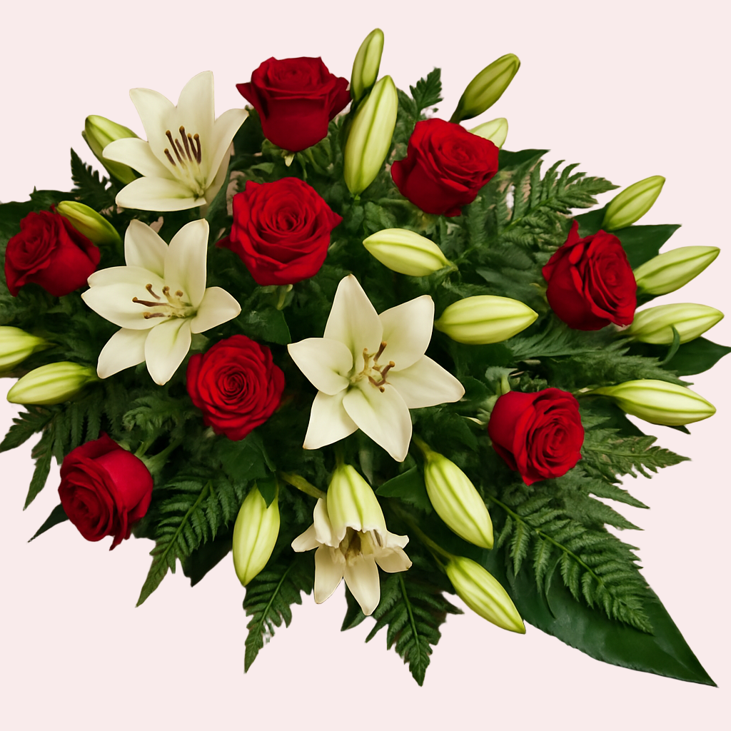Denne elegante båredekoration kombinerer den dybe symbolik af røde roser og med renheden af hvide liljer. Dekorationen, der er designet med frodigt grønt, udtrykker kærlighed, respekt og et evigt minde. Den er velegnet til at lægge ved kisten eller graven og er en værdig måde at ære mindet om en kær på.
