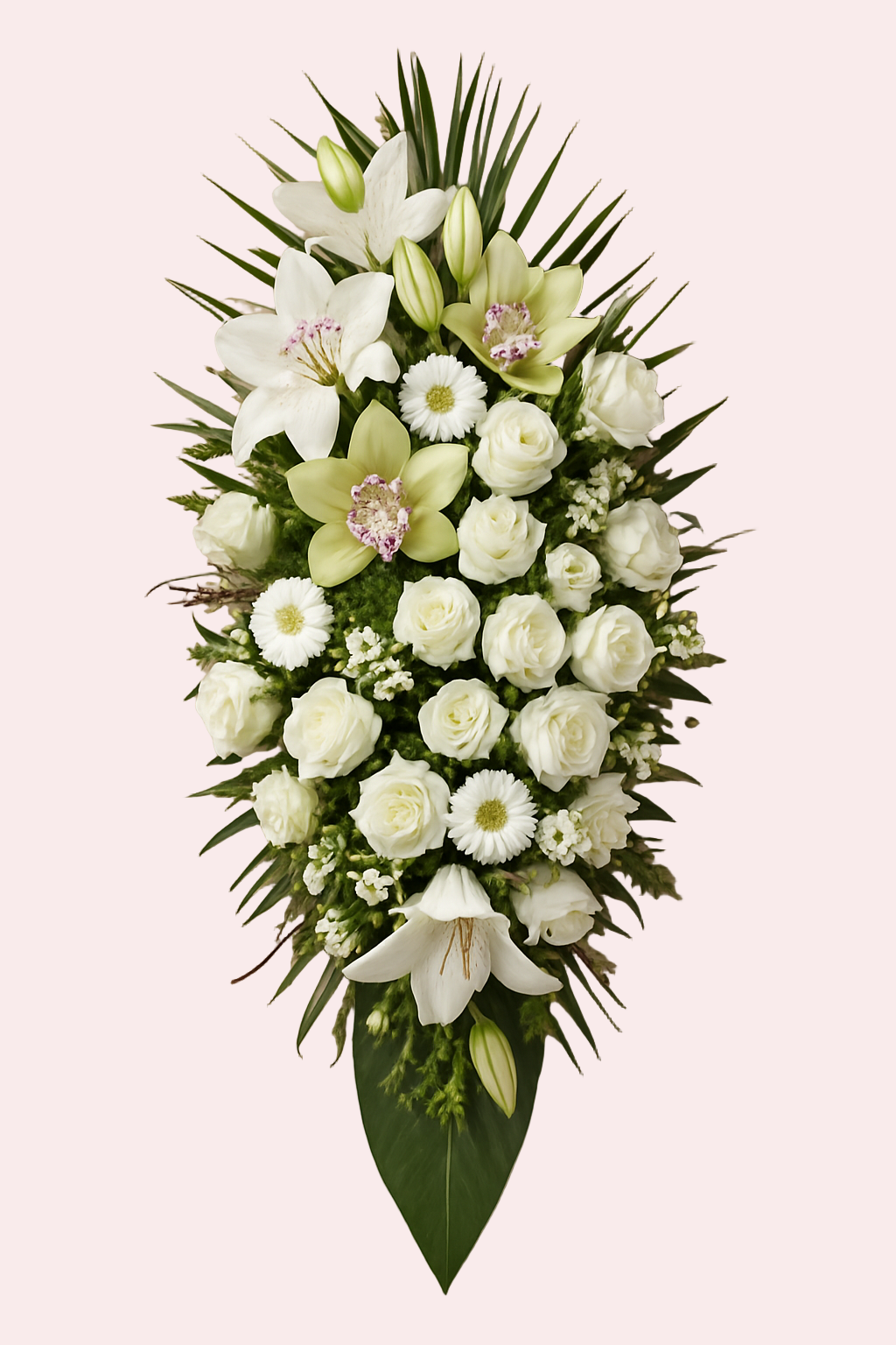 Dette smukke begravelses arrangement med orkideer og hvide liljer er en raffineret hyldest, der symboliserer kærlighed, fred og minde. Denne elegante dekoration kombinerer eksotiske orkideer, rene hvide liljer, delikate roser og frisk grønt i et naturligt, flydende design. Dens blide skønhed udtrykker respekt og oprigtig kondolence, og er derfor velegnet til ceremonier, gudstjenester eller afsked ved graven.