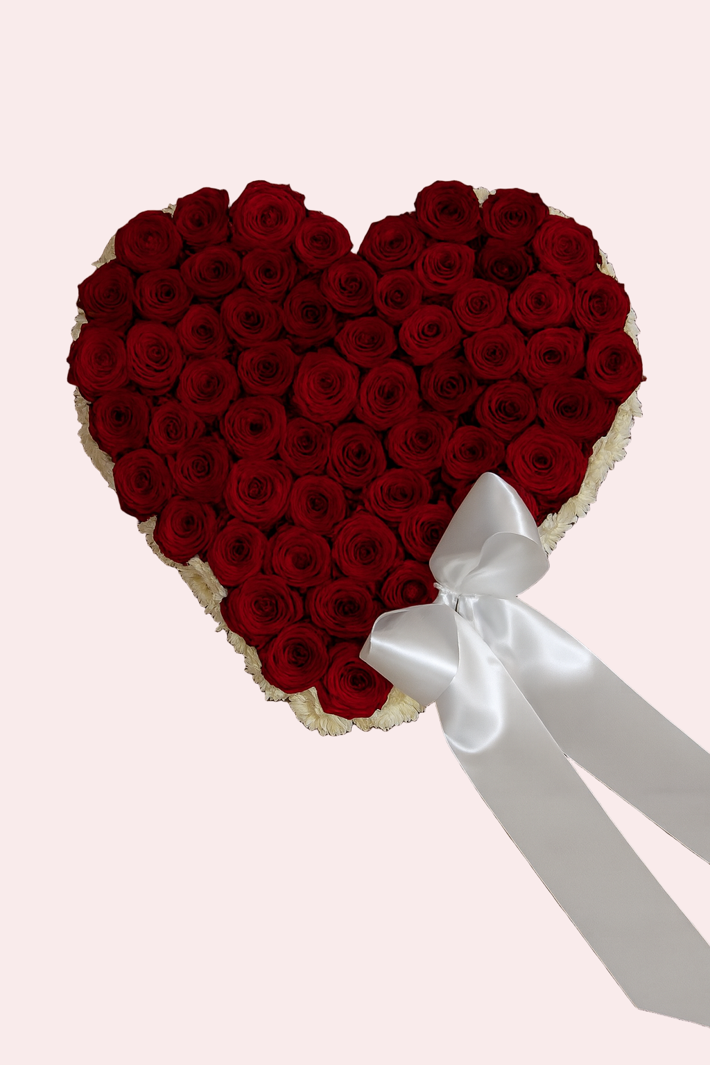 En tidløs og elegant arrangement i hjerteform, lavet med dyb røde roser, der symboliserer evig kærlighed og minde. Hjerteformen er smukt rammet af delikate hvide blomster, der skaber en blød og værdig kontrast. Dette blomsterarrangement er en meningsfuld måde at ære mindet om en elsket, udtrykke kærlighed, respekt og evig tilstedeværelse. Perfekt til begravelser.
