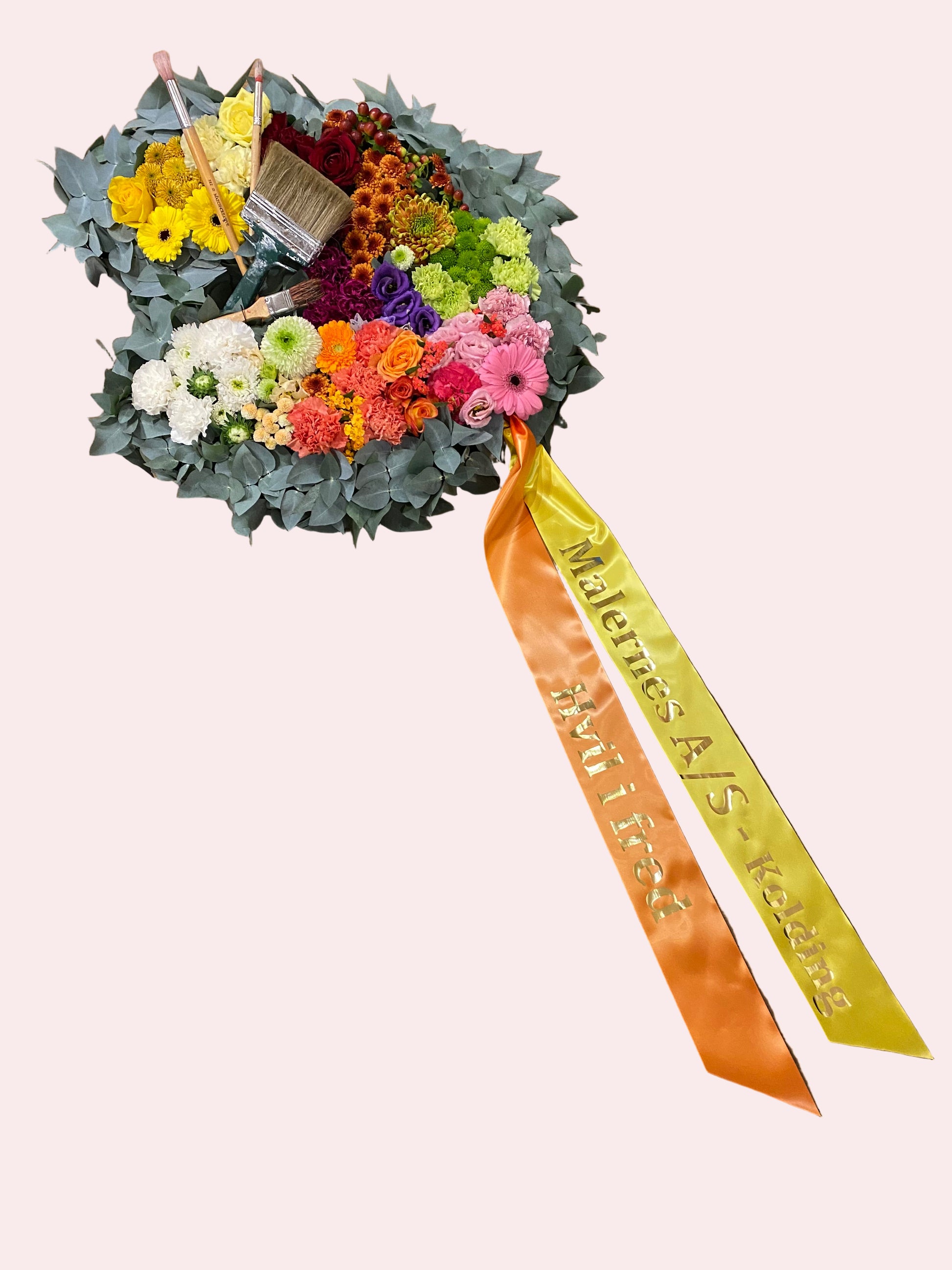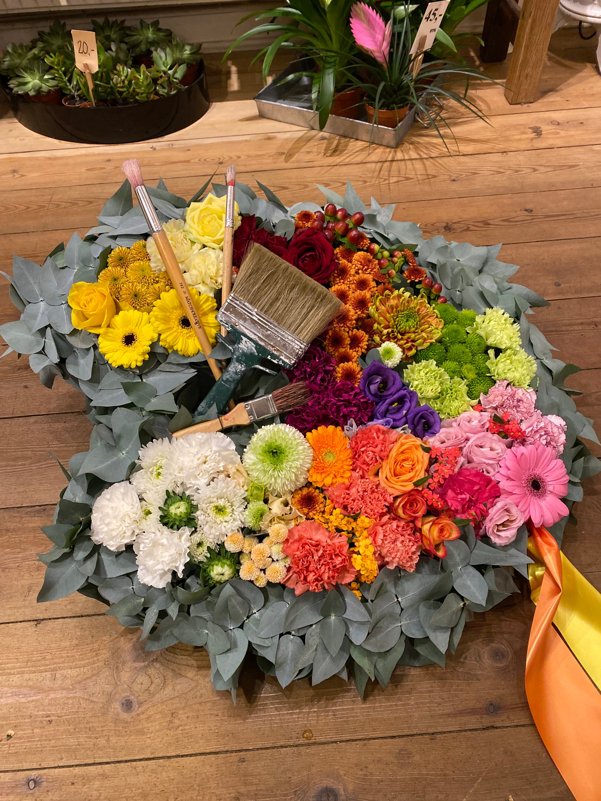En levende og kunstnerisk blomsterhyldest formet som en malers palet — en hjertelig afsked til en kreativ sjæl.