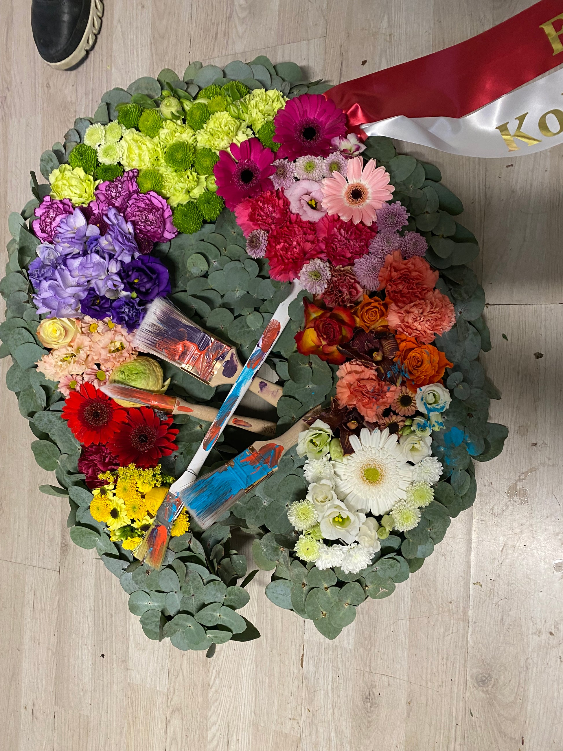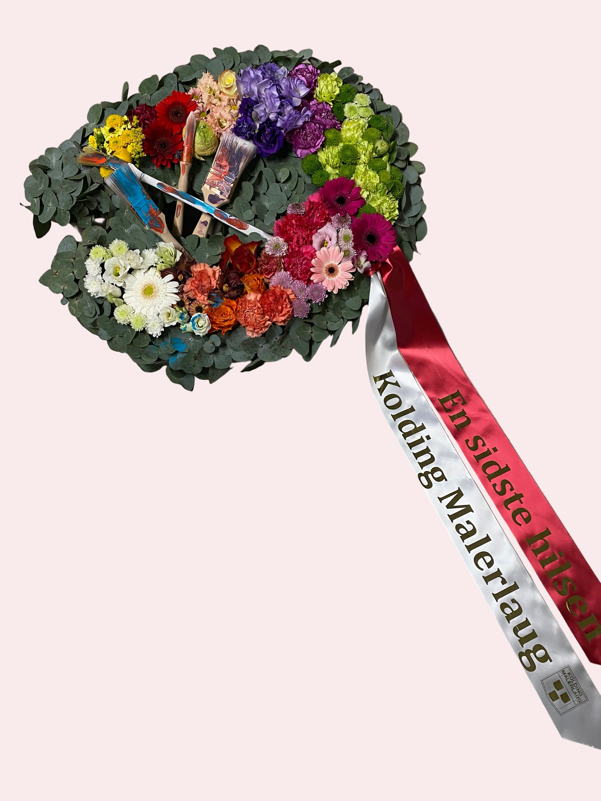 Et fantastisk og kreativt begravelsesarrangement inspireret af kunstens verden – formet som en malers palet med farverige blomster og penseldetaljer.