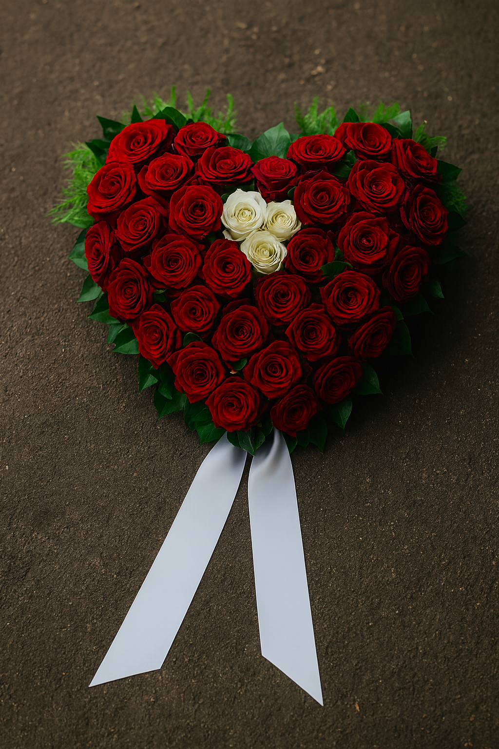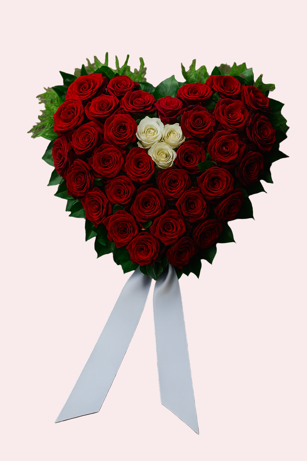 Et smukt rødt rosehjerte med en delikat hvid rose i midten, der symboliserer kærlighed, renhed og erindring. Dette arrangement skaber en slående, men fredfyldt hyldest til en, man elsker.