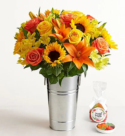 Solrige solsikker, orange liljer og gule roser danner en livlig og glad efterårsbuket. Den perfekte gave til fødselsdage, taksigelser eller blot for at bringe et smil.